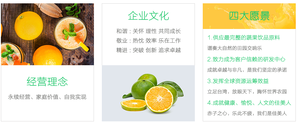 我們秉承著專業(yè)技術(shù)及嚴謹?shù)慕?jīng)營態(tài)度,在不斷地鉆研、開發(fā)與創(chuàng)新下,成功地將四季水果的新鮮風味與營養(yǎng)長期完整的保存。十月份果實成熟后,我們將最新鮮的果實用最天然的方式加工成果汁。